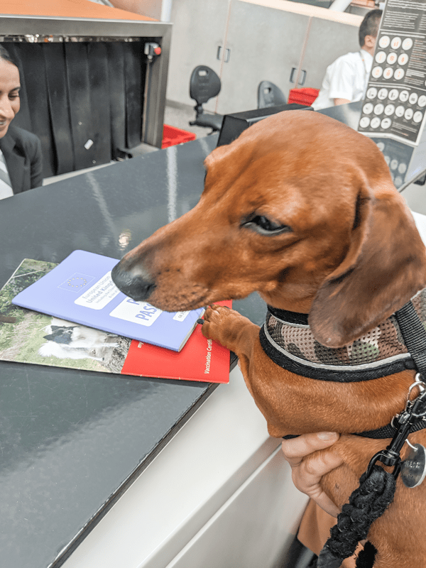 They checked his pet passport and microchip and because all his documents were correct and he had the tapeworm the process was very quick and easy. They presented us with a ticket we had to display on the dashboard of our car and we went on our way. (Don’t forget to have a pee break).